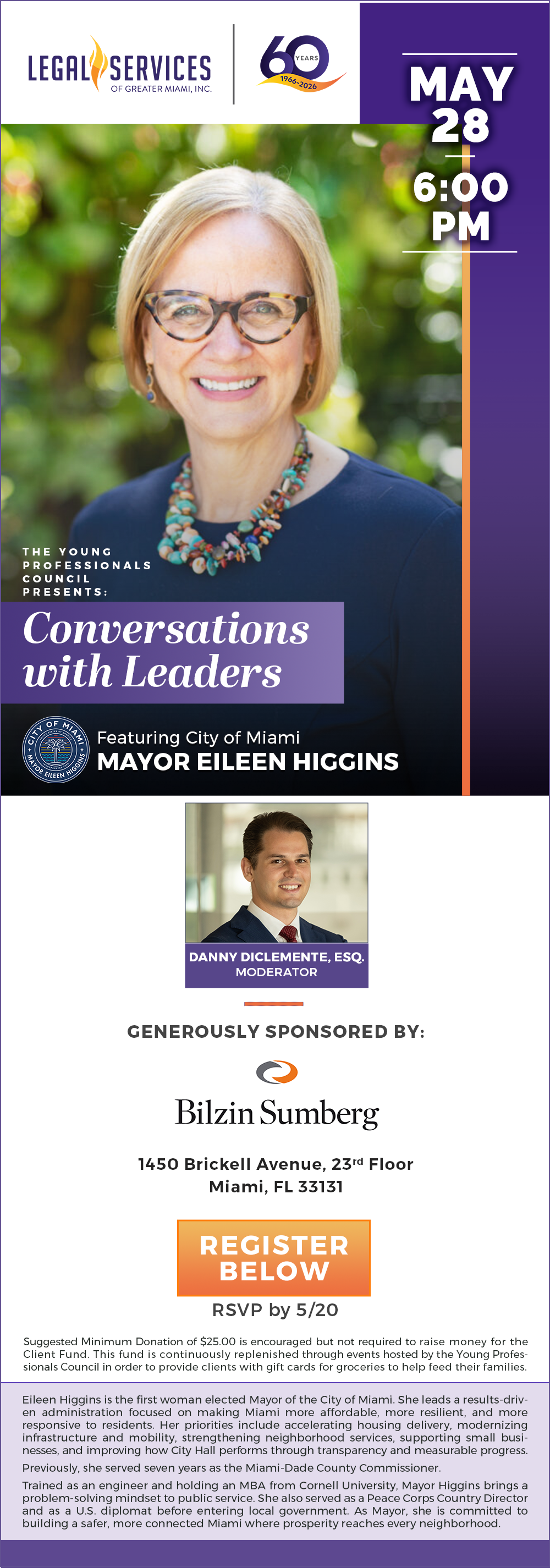 Conversations with Leaders featuring City of Miami Mayor Eileen Higgins Thursday, May 28, 2026 6:00 PM 8:00 PM Bilzin Sumberg 1450 Brickell Avenue, 23rd Floor Miami, FL, 33131 United States (map) Google Calendar ICS